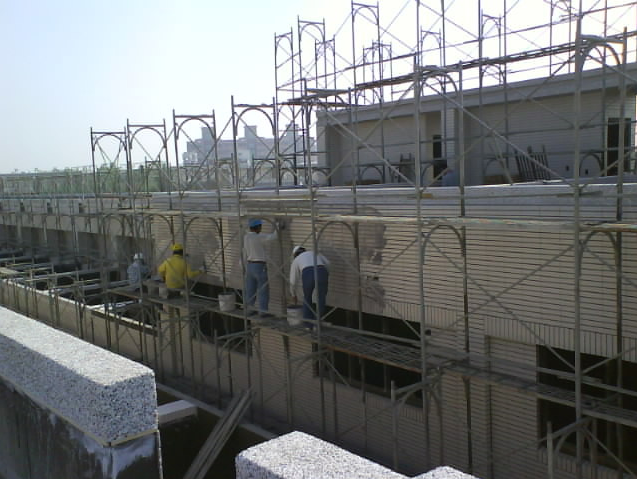 防水砂浆施工: 按水泥:中砂=1:2.5~3比例掺入水泥用量的10%硅质防水剂,搅拌均匀。 防水砂浆厚度20?,二抹二压一次成活,收水时二次压光。 伸缩缝根据设计要求确定,防水砂浆层连续超过6米必须设伸缩缝(6米以内可不设伸缩缝)。